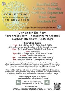 10th September – Eco-Fest at Llanbedr – There will be events throughout the day, with stalls and tents from organisations with information about what you can do to help tackle Climate Change. With music from Holywell Band and creative African drums, 2 short mindfulness walks run in the morning and afternoon up to Old St Peter’s church and plenty to keep the younger ones entertained, as we come together to celebrate nature and creation.