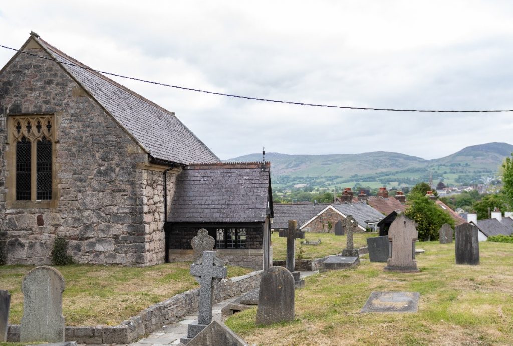 Llanfwrog Church is situated on the top of a hill on the western edge of the market town of Ruthin. It still retains a distinct rural atmosphere and there are extensive views of the Vale of Clwyd and the mountains of the Clwydian range from the churchyard.