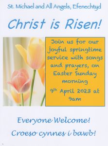 Welcome to this week’s newsletter, a copy of which is attached along with an array of posters. As we enter Holy Week, there are many services planned throughout Dyffryn Clwyd Mission Area, to which you are all invited and most welcome to attend. The details of which you can find attached, listed below in brief detail and also contained within the newsletter.