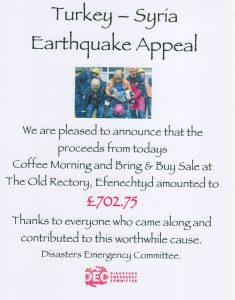 We are pleased to announce that Efenechtyd raised a fantastic £702.75 for the DEC Turkey Syria Earthquake Appeal. A great result and Efenechtyd’s grateful thanks go to everyone who came along, supported and donated.
