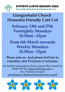 A big call out for volunteers! Anyone wishing to attend will receive a very warm welcome, and volunteers are always hugely appreciated so if you have a couple of hours to spare, please contact Mair Ansell on 01824 790 726 / mairansell@aol.com or Rev Natasha on email natashaquinn-thomas@churchinwales.org.uk.