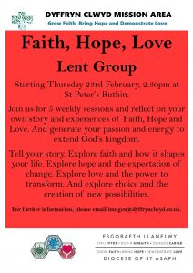 Bible study at Llanfair DC started on Friday 24 February and will run fortnightly during LENT. We are reading the Gospel of John. Please contact Rev Richard Carter for further information on email RichardCarter@churchinwales.org.uk.