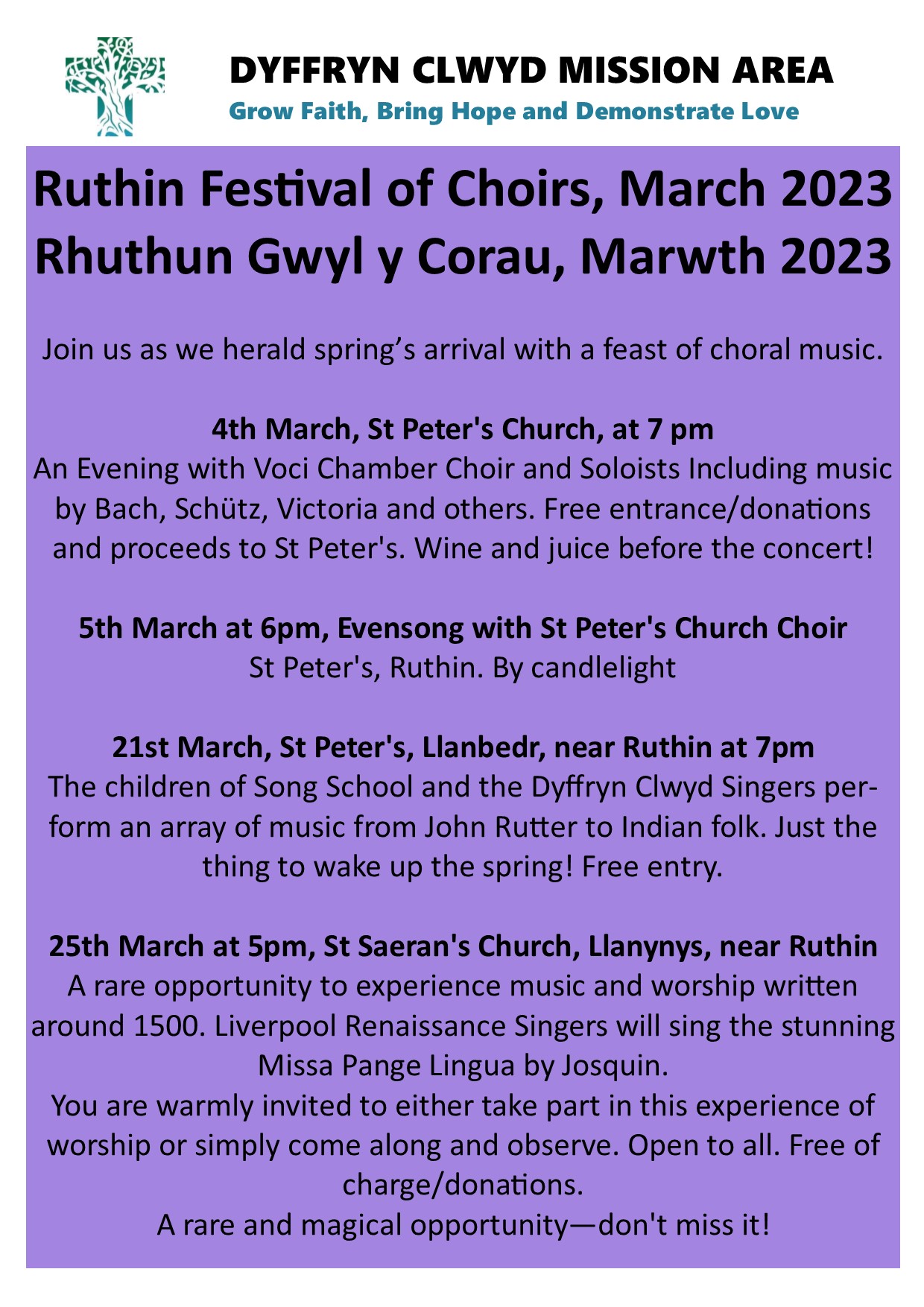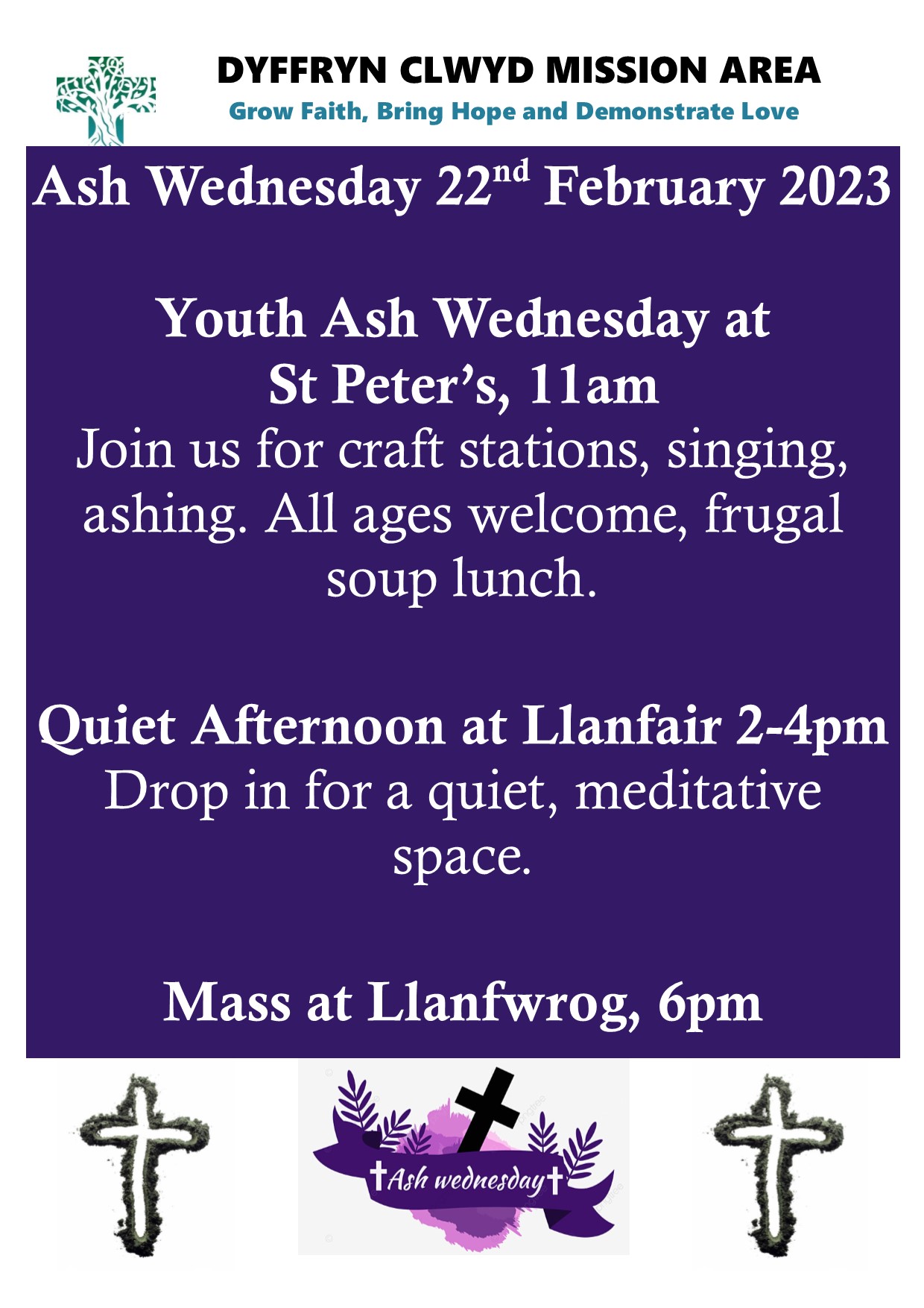 Welcome to this week’s newsletter, a copy of which is attached along with an array of posters advertising the various events happening throughout Dyffryn Clwyd Mission Area.