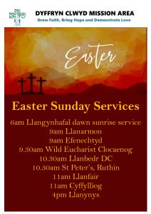 Maundy Thursday 6th April: 6pm Llanynys, 6.30pm Clocaenog, 8pm Llanbedr DC, 8pm St Peter’s Ruthin, 9pm – 12pm At the Outdoor Altar in Llanbedr DC