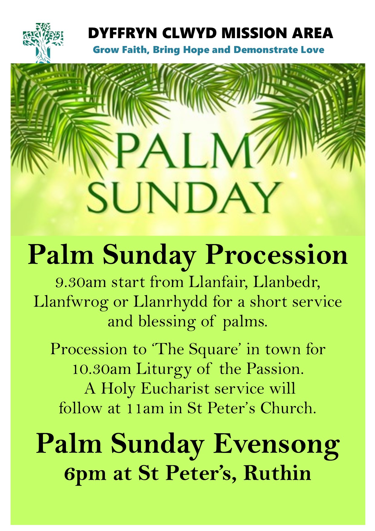 Palm Sunday 2nd April Procession 9.30am start from Llanfair, Llanbedr, Llanfwrog or Llanrhydd for short service and palms blessing. Procession to ‘The Square’ in town for 10.30am Liturgy of the Passion. 11am Holy Eucharist service in St Peter’s Church.