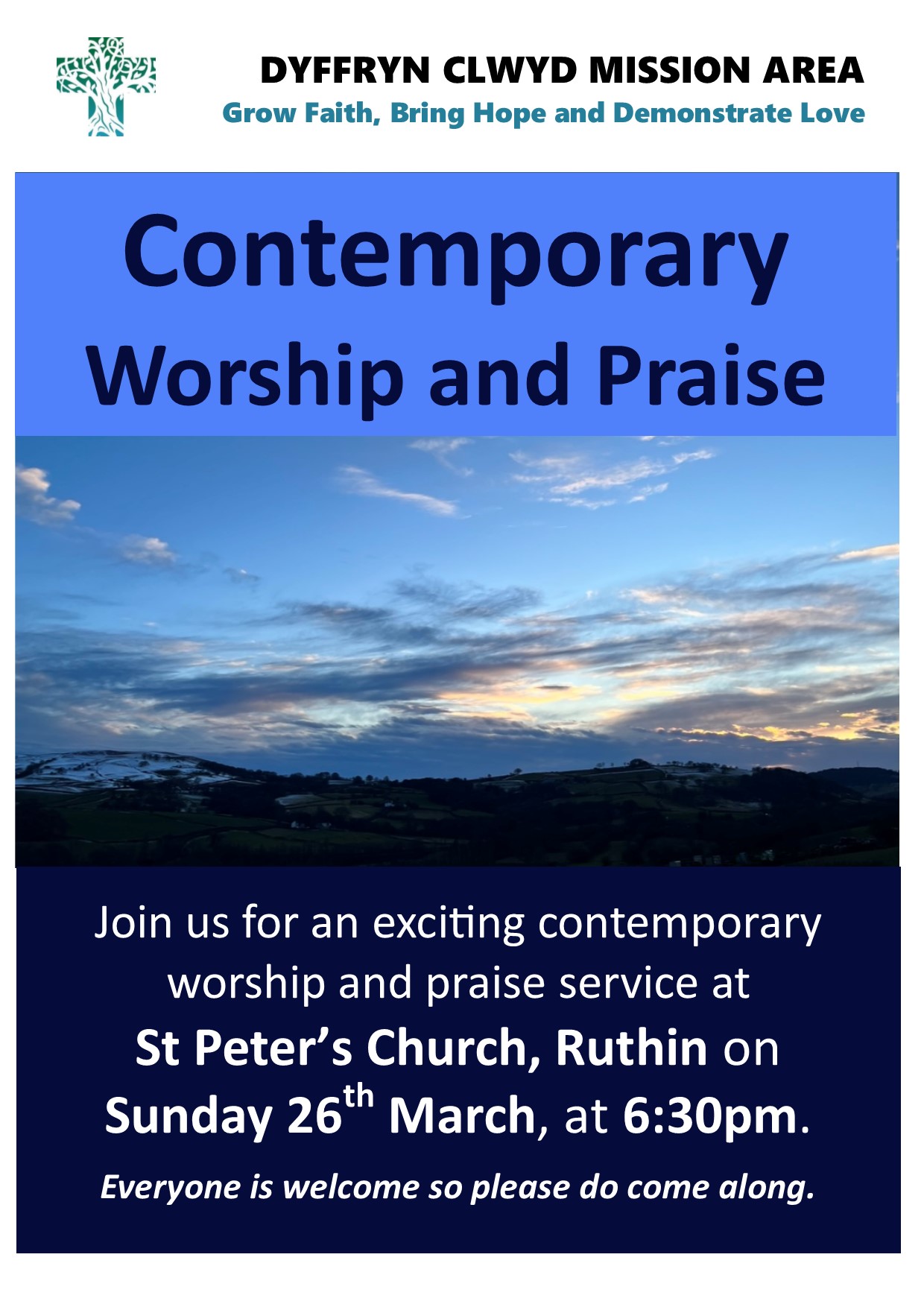 Join us for an exciting contemporary worship and praise service at St Peter’s Church, Ruthin on Sunday 26th March, at 6:30pm. Everyone is welcome so please do come along.