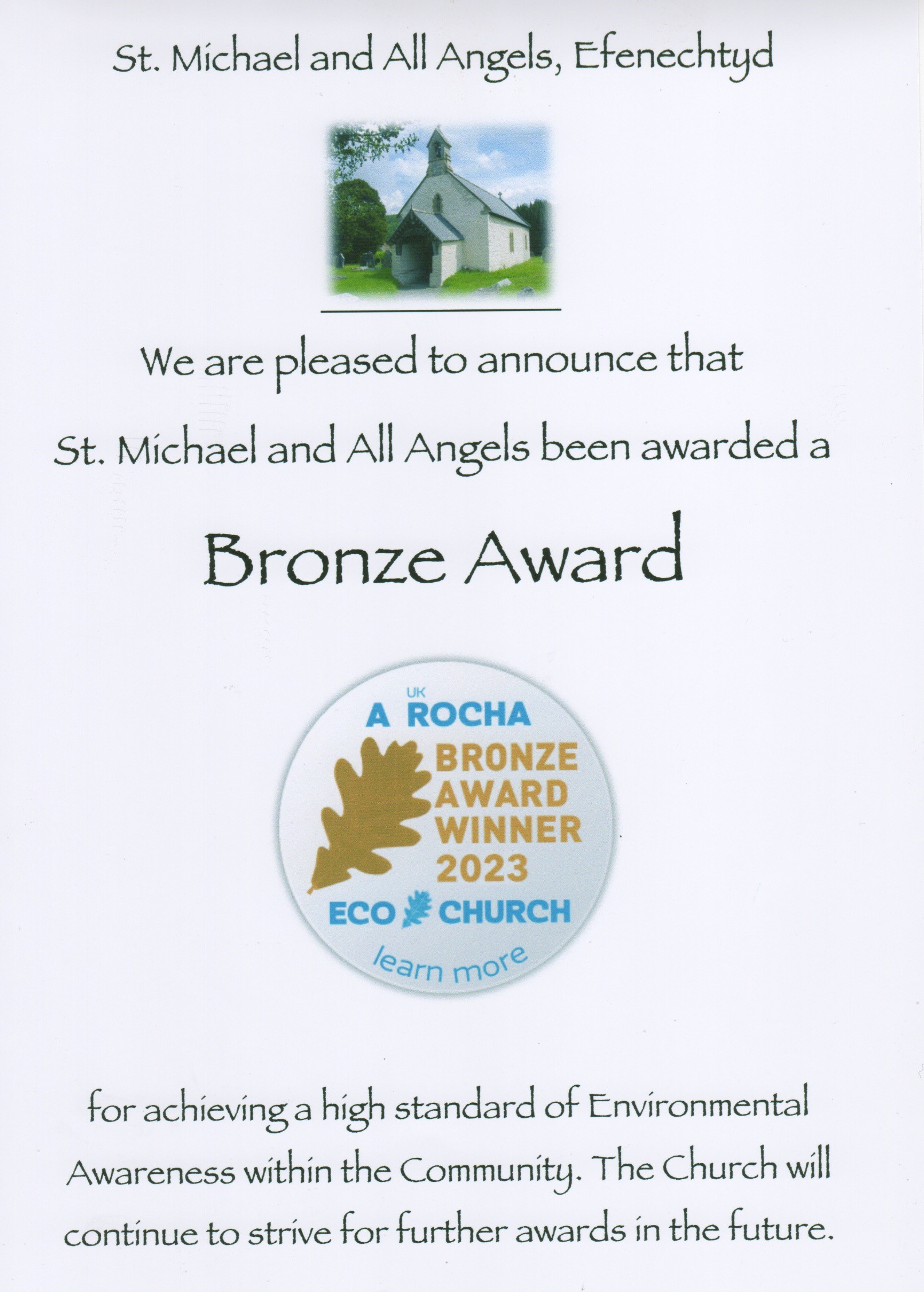 Well done on achieving the Bronze Eco Church award from A Rocha.