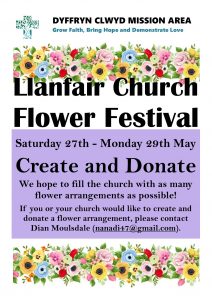 Saturday 27th to Monday 29th May Llanfair Flower Festival: Please CREATE AND DONATE A FLORAL DISPLAY. Calling all budding florists; we hope to fill the church with as many flower arrangements as possible and need your help!