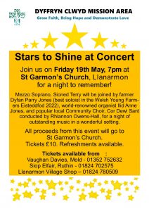Friday 19th May, 7pm: Stars to Shine at Concert at St Garmon’s Church, Llanarmon. Tickets £10 and please see poster for details on how to purchase.