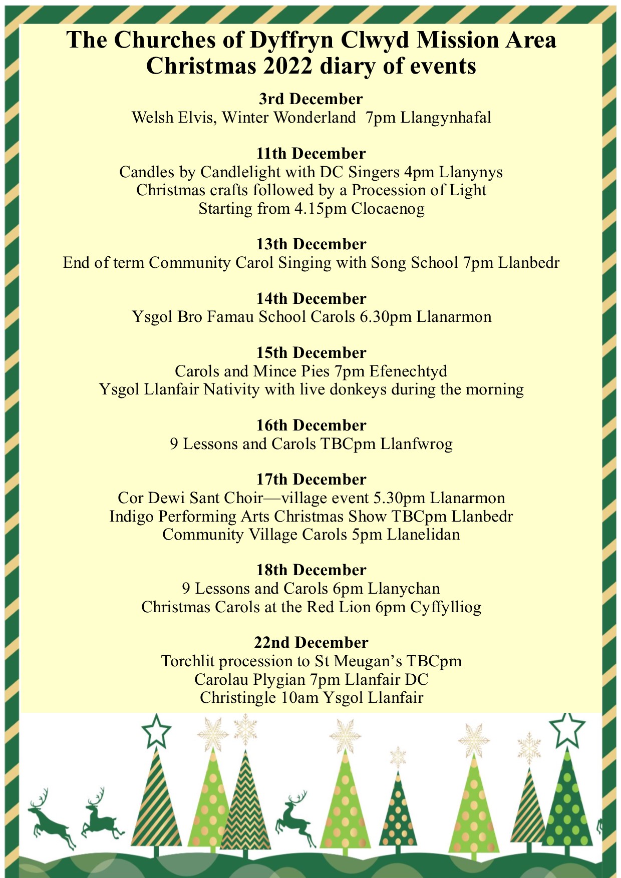 There are quite a lot of events happening over the next few weeks so I would be very grateful if you could please share these posters with anyone not on the newsletter distribution list, and perhaps display on your noticeboards, Facebook pages and throughout any other groups, too. Don’t forget, you can also find further information on what’s happening on the Dyffryn Clwyd website: https://dyffrynclwyd.co.uk/christmas.