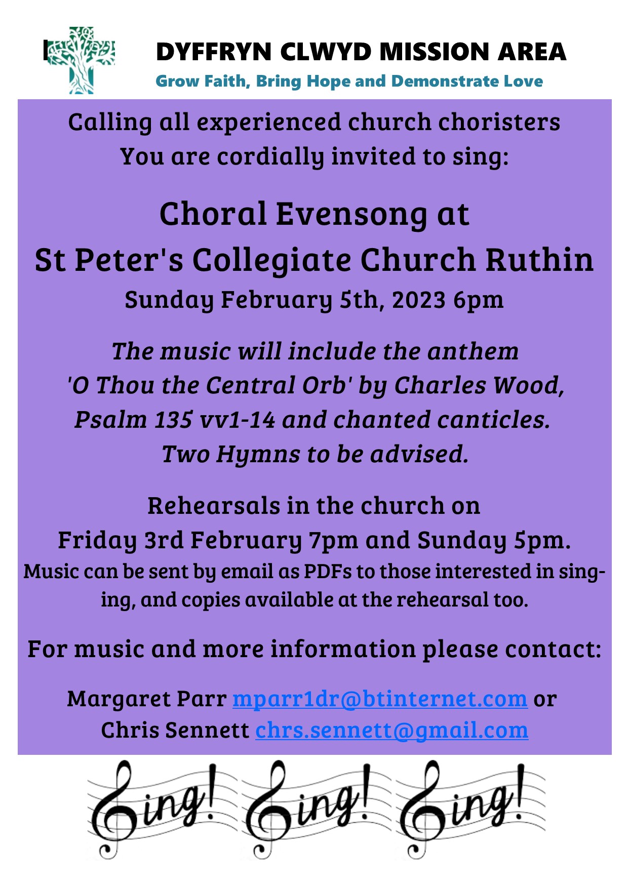 Choral Evensong at St Peter’s Ruthin on Sunday February 5th, 2023 6pm.