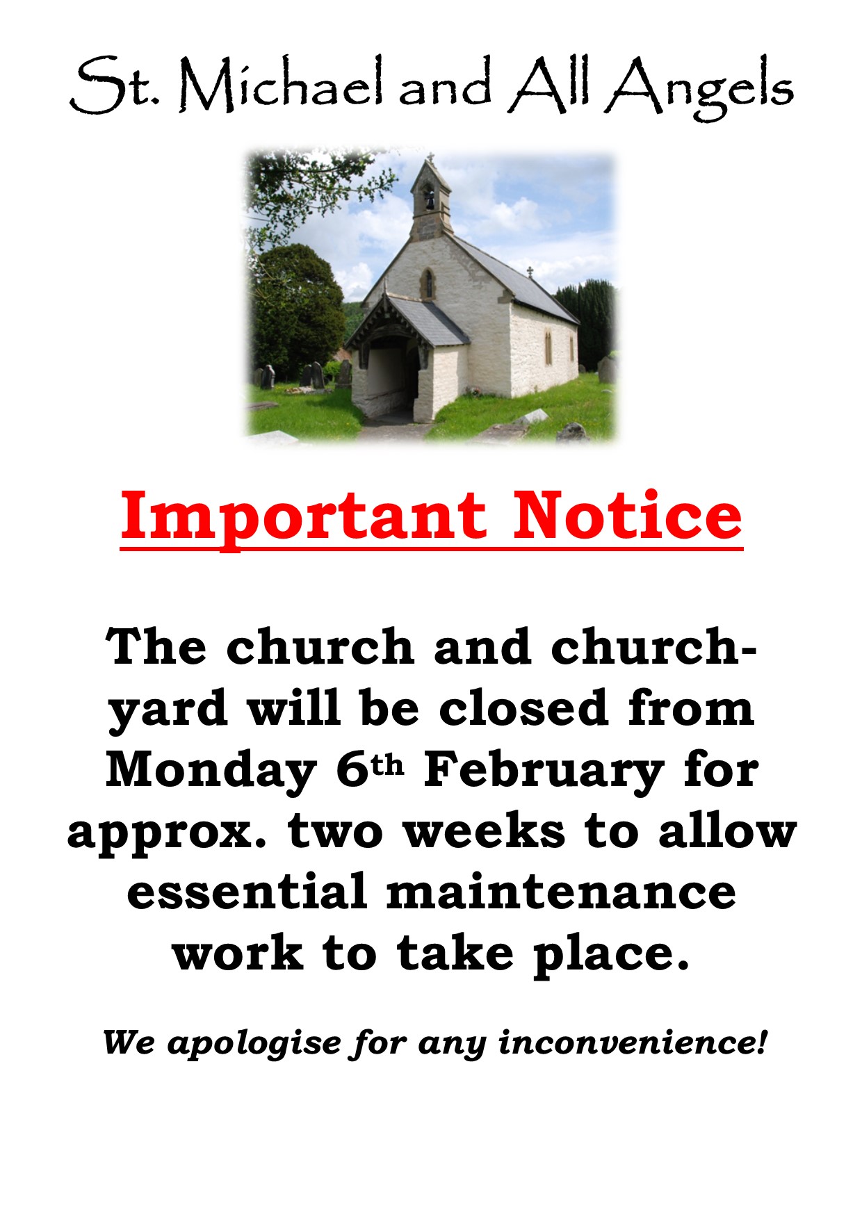 Important Notice! Please note, the church and churchyard will be closed from Monday 6th February for approx. two weeks to allow essential maintenance work to take place.